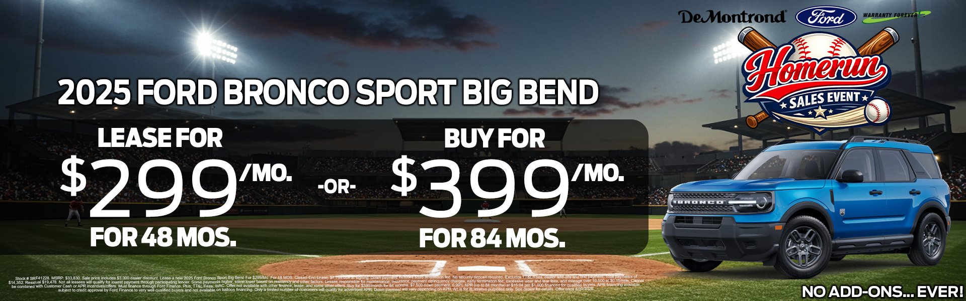 *Credit restrictions may apply. Dealer Discounts available to everyone. Certain other manufacturer offers may not be available to everyone. Pricing includes every available current offer from manufacturer. Ask your dealer for details. All prices on this web site are subject to change without notice. Though we make every effort to provide you the most accurate, up-to-date information, occasionally, one or more vehicles on our web site may be incorrect due to typographical, photographic, occasional human or technical error. We reserve the right to refuse to honor any incorrect Internet prices as we cannot account for the occasional human or technical error. Discounted prices include all available applicable Factory Rebates and Incentives and Dealer Discount. All prices plus Sales Tax, Title, License Fee, and Registration Fee. Please contact dealer for details. Manufacturer's/Distributor's Rebate subject to residency restrictions. Any customer not meeting the residency restriction will receive a dealer discount in the same amount of the manufacturer's/distributor's rebate. If you live in the following California Emissions States of CA, CT, DE, MD, ME, NJ, NY, OR, PA, RI, VT, and WA, please be aware that those states will not title a new vehicle from Texas because the MSO is not listed as being a 50 State/California Emission Vehicle. . Manufacturer’s Rebate subject to residency restrictions. Any customer not meeting the residency restrictions will receive a dealer discount in the same amount of the manufacturer’s rebate. Dealer doc. fee is $150. By requesting information, you agree that DeMontrond (Dealership) and its affiliates, and sales professionals may call/text you about your inquiry, which may involve use of automated means and prerecorded/artificial voices. Message/data rates may apply.