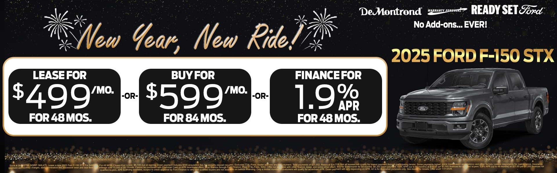 *Credit restrictions may apply. Dealer Discounts available to everyone. Certain other manufacturer offers may not be available to everyone. Pricing includes every available current offer from manufacturer. Ask your dealer for details. All prices on this web site are subject to change without notice. Though we make every effort to provide you the most accurate, up-to-date information, occasionally, one or more vehicles on our web site may be incorrect due to typographical, photographic, occasional human or technical error. We reserve the right to refuse to honor any incorrect Internet prices as we cannot account for the occasional human or technical error. Discounted prices include all available applicable Factory Rebates and Incentives and Dealer Discount. All prices plus Sales Tax, Title, License Fee, and Registration Fee. Please contact dealer for details. Manufacturer's/Distributor's Rebate subject to residency restrictions. Any customer not meeting the residency restriction will receive a dealer discount in the same amount of the manufacturer's/distributor's rebate. If you live in the following California Emissions States of CA, CT, DE, MD, ME, NJ, NY, OR, PA, RI, VT, and WA, please be aware that those states will not title a new vehicle from Texas because the MSO is not listed as being a 50 State/California Emission Vehicle. . Manufacturer’s Rebate subject to residency restrictions. Any customer not meeting the residency restrictions will receive a dealer discount in the same amount of the manufacturer’s rebate. Dealer doc. fee is $150. By requesting information, you agree that DeMontrond (Dealership) and its affiliates, and sales professionals may call/text you about your inquiry, which may involve use of automated means and prerecorded/artificial voices. Message/data rates may apply.