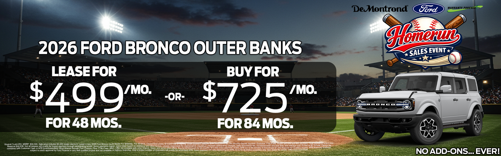 *Credit restrictions may apply. Dealer Discounts available to everyone. Certain other manufacturer offers may not be available to everyone. Pricing includes every available current offer from manufacturer. Ask your dealer for details. All prices on this web site are subject to change without notice. Though we make every effort to provide you the most accurate, up-to-date information, occasionally, one or more vehicles on our web site may be incorrect due to typographical, photographic, occasional human or technical error. We reserve the right to refuse to honor any incorrect Internet prices as we cannot account for the occasional human or technical error. Discounted prices include all available applicable Factory Rebates and Incentives and Dealer Discount. All prices plus Sales Tax, Title, License Fee, and Registration Fee. Please contact dealer for details. Manufacturer's/Distributor's Rebate subject to residency restrictions. Any customer not meeting the residency restriction will receive a dealer discount in the same amount of the manufacturer's/distributor's rebate. If you live in the following California Emissions States of CA, CT, DE, MD, ME, NJ, NY, OR, PA, RI, VT, and WA, please be aware that those states will not title a new vehicle from Texas because the MSO is not listed as being a 50 State/California Emission Vehicle. . Manufacturer’s Rebate subject to residency restrictions. Any customer not meeting the residency restrictions will receive a dealer discount in the same amount of the manufacturer’s rebate. Dealer doc. fee is $150. By requesting information, you agree that DeMontrond (Dealership) and its affiliates, and sales professionals may call/text you about your inquiry, which may involve use of automated means and prerecorded/artificial voices. Message/data rates may apply.