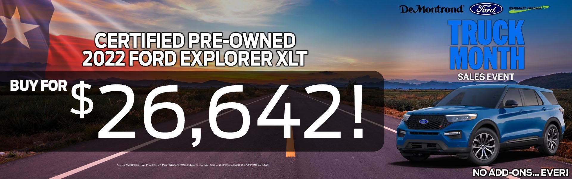 *Credit restrictions may apply. Dealer Discounts available to everyone. Certain other manufacturer offers may not be available to everyone. Pricing includes every available current offer from manufacturer. Ask your dealer for details. All prices on this web site are subject to change without notice. Though we make every effort to provide you the most accurate, up-to-date information, occasionally, one or more vehicles on our web site may be incorrect due to typographical, photographic, occasional human or technical error. We reserve the right to refuse to honor any incorrect Internet prices as we cannot account for the occasional human or technical error. Discounted prices include all available applicable Factory Rebates and Incentives and Dealer Discount. All prices plus Sales Tax, Title, License Fee, and Registration Fee. Please contact dealer for details. Manufacturer's/Distributor's Rebate subject to residency restrictions. Any customer not meeting the residency restriction will receive a dealer discount in the same amount of the manufacturer's/distributor's rebate. If you live in the following California Emissions States of CA, CT, DE, MD, ME, NJ, NY, OR, PA, RI, VT, and WA, please be aware that those states will not title a new vehicle from Texas because the MSO is not listed as being a 50 State/California Emission Vehicle. . Manufacturer’s Rebate subject to residency restrictions. Any customer not meeting the residency restrictions will receive a dealer discount in the same amount of the manufacturer’s rebate. Dealer doc. fee is $150. By requesting information, you agree that DeMontrond (Dealership) and its affiliates, and sales professionals may call/text you about your inquiry, which may involve use of automated means and prerecorded/artificial voices. Message/data rates may apply.