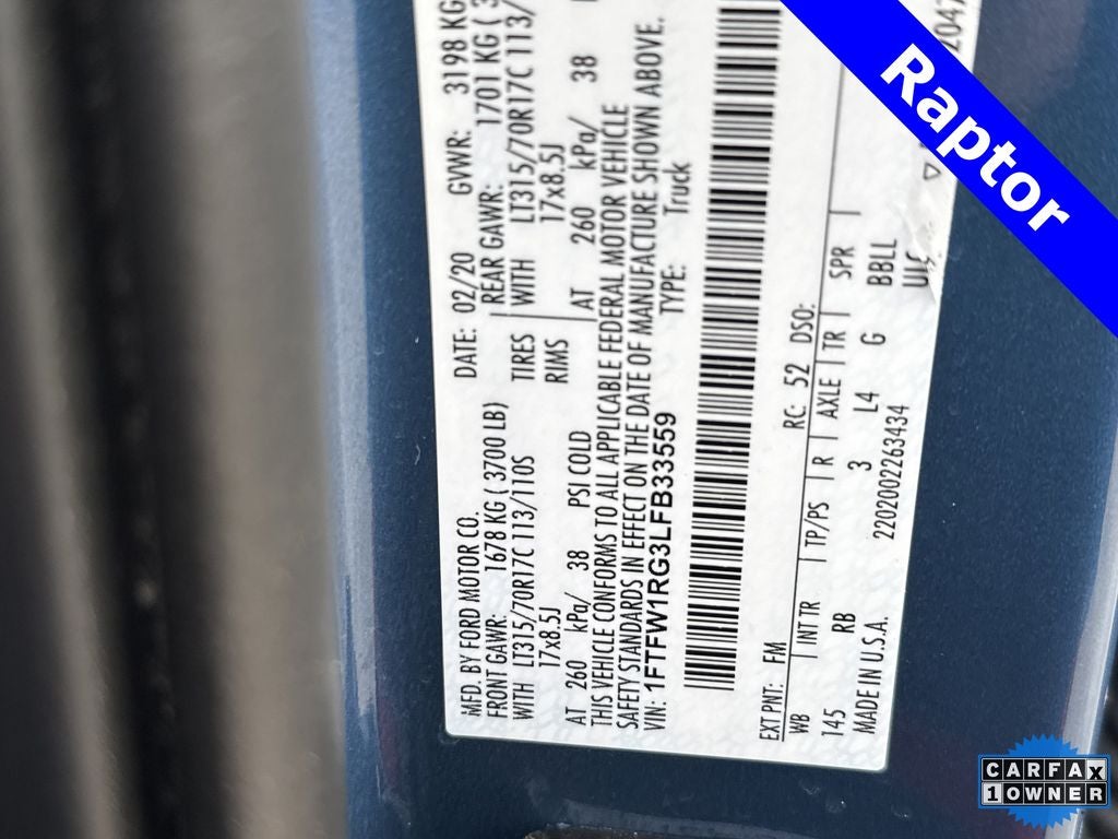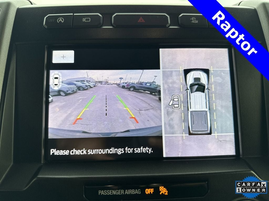 Equipment Group 802A Luxury (10-Way Power Driver & Passenger Seats, 360 Degree Camera, 4.10 Front Axle w/Torsen Differential, 8 Productivity Screen, Adaptive Cruise Control w/Stop-and-Go, Advanced Security Pack, Ambient Lighting - Ice Blue Color Only, BLIS Blind Spot Information System, Dual-Zone Electronic Automatic Temperature Control, Electronic Locking w/4.10 Axle Ratio, Heated Steering Wheel, Heated Windshield Wiper Park, Inflatable Rear Safety Belts, Integrated Trailer Brake Controller, Intelligent Access w/Push-Button Start, Lane Keeping System, LED Box Lighting, LED Sideview Mirror Spotlights, Memory System (Seat, Pedal, Exterior Mirror), Power Glass Sideview Mirr w/Body-Color Skull Caps, Power Tilt/Telescoping Steering Column w/Memory, Power-Adjustable Pedals, Power-Sliding Rear Window, Pro Trailer Backup Assist, Radio: B&O Sound System by Bang & Olufsen, Remote Start System w/Remote Tailgate Release, SYNC 3, Tailgate Applique FORD, Universal Garage Door Opener, and Voice-Activated Touchscreen Navigation), GVWR: 7,050 lbs Payload Package, Raptor Exterior Graphics Package, 4WD, 17 Cast Aluminum Wheels, 17 Forged Aluminum Bead-Lock Capable Wheels, 4-Wheel Disc Brakes, 7 Speakers, 8-Way Power Driver's Seat w/Power Lumbar, ABS brakes, Air Conditioning, Alloy wheels, AM/FM radio: SiriusXM, Auto High-beam Headlights, Auto-dimming Rear-View mirror, Brake assist, Compass, Delay-off headlights, Driver door bin, Driver vanity mirror, Dual front impact airbags, Dual front side impact airbags, Electronic Stability Control, Emergency communication system: SYNC 3 911 Assist, Exterior Parking Camera Rear, Front anti-roll bar, Front Bucket Seats, Front Center Armrest, Front reading lights, Front wheel independent suspension, Fully automatic headlights, Heated Leather 40/Console/40 Front Seats, Illuminated entry, Leather steering wheel, Low tire pressure warning, Occupant sensing airbag, Outside temperature display, Overhead airbag, Overhead console, Panic alarm, Passenger door bin, Passenger vanity mirror, Power door mirrors, Power driver seat, Power steering, Power windows, Radio data system, Radio: SiriusXM w/7 Speakers, Rear Parking Sensors, Rear reading lights, Rear step bumper, Rear window defroster, Remote keyless entry, Remote Start System, Second-Row Heated Seats, Security system, Speed control, Speed-sensing steering, Split folding rear seat, Steering wheel mounted audio controls, Tachometer, Tailgate Step w/Tailgate Lift Assist, Telescoping steering wheel, Tilt steering wheel, Traction control, Trip computer, Twin Panel Moonroof, Unique Cloth Trim Seats, and Variably intermittent wipers.
