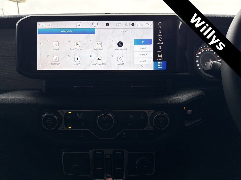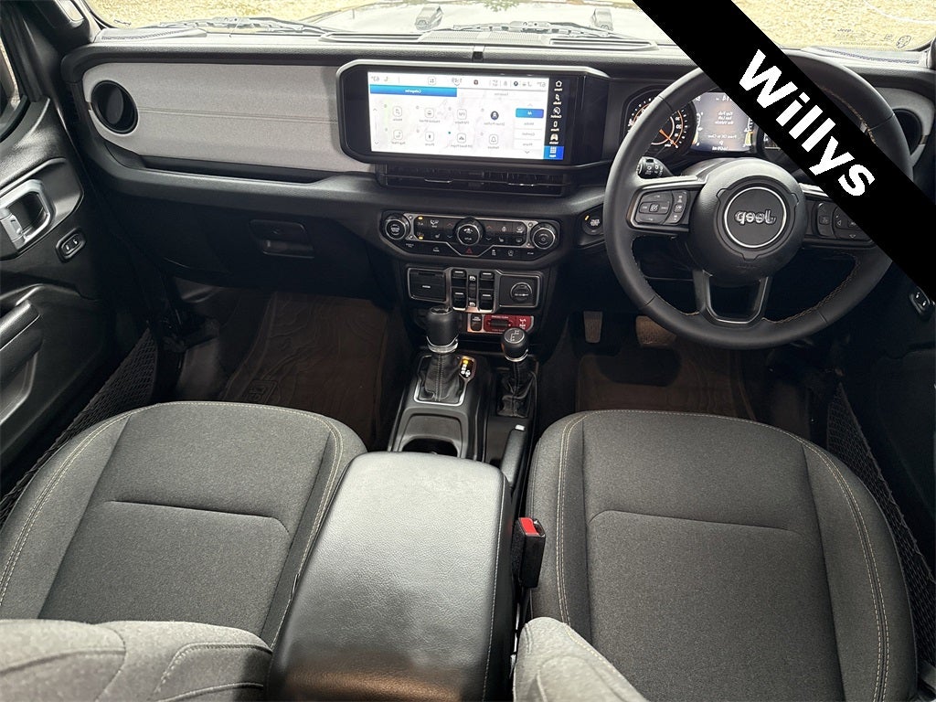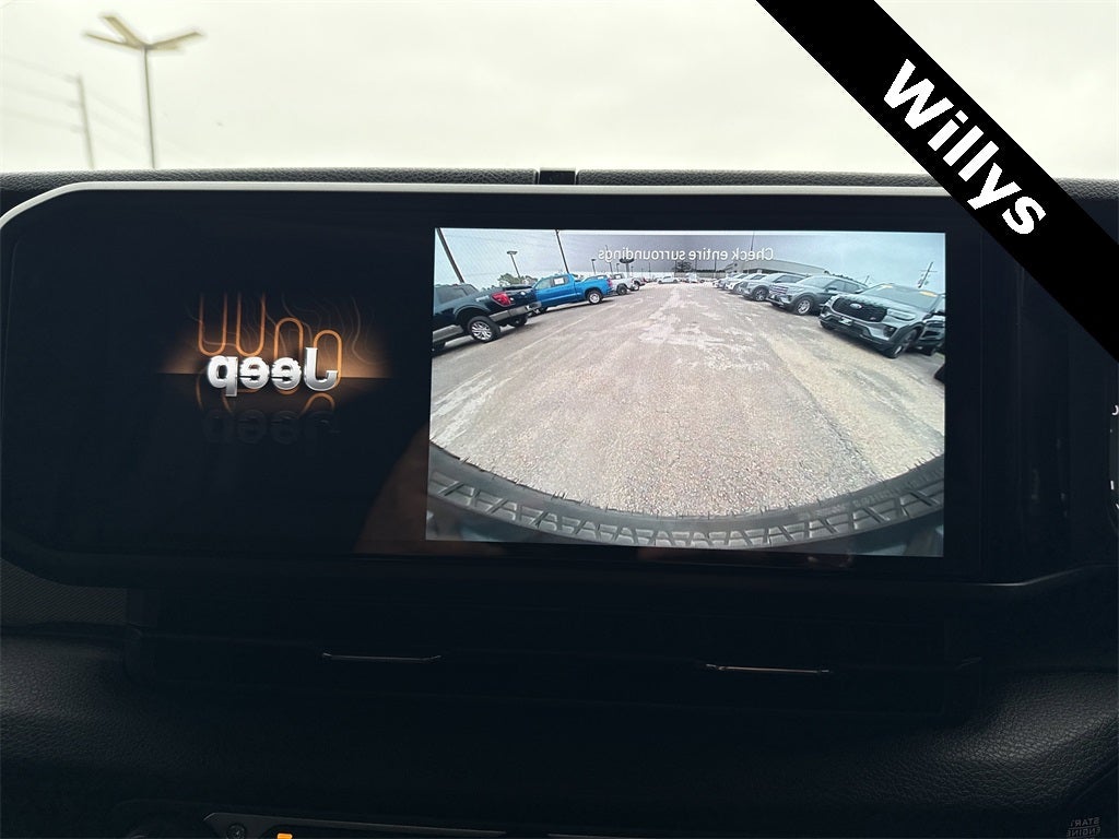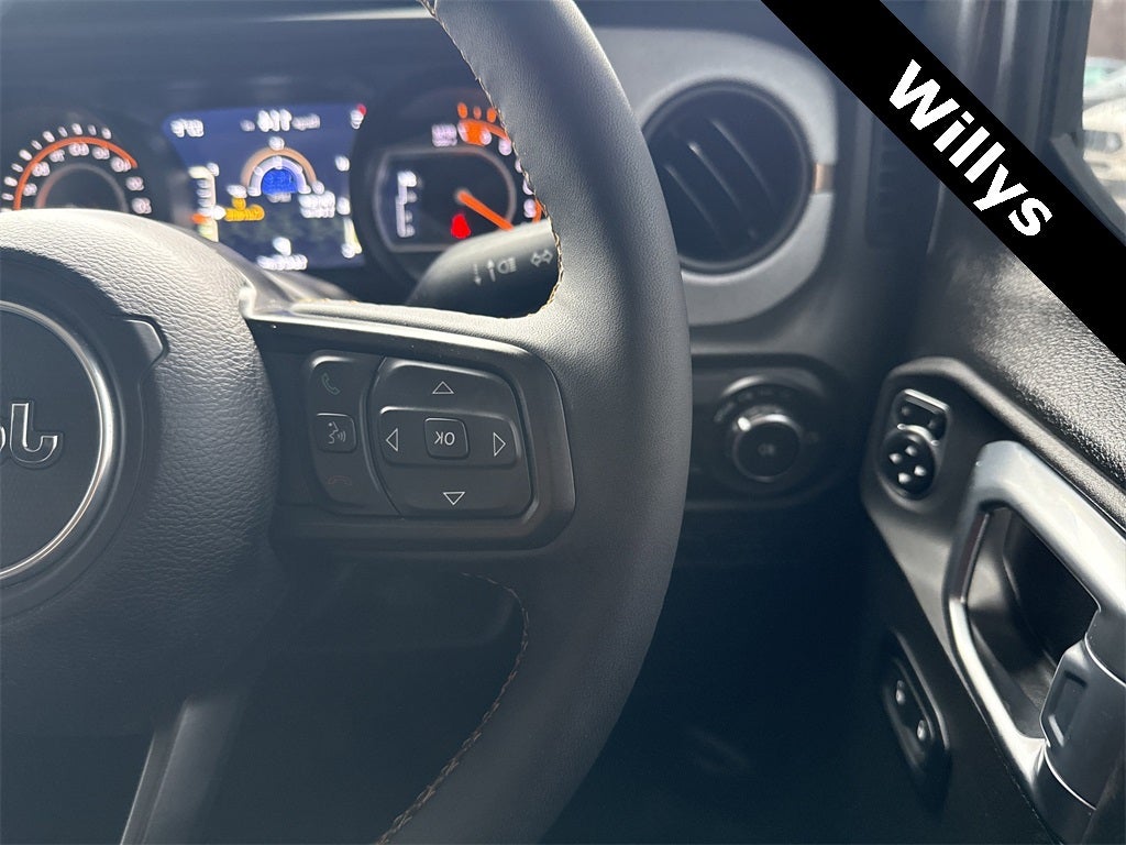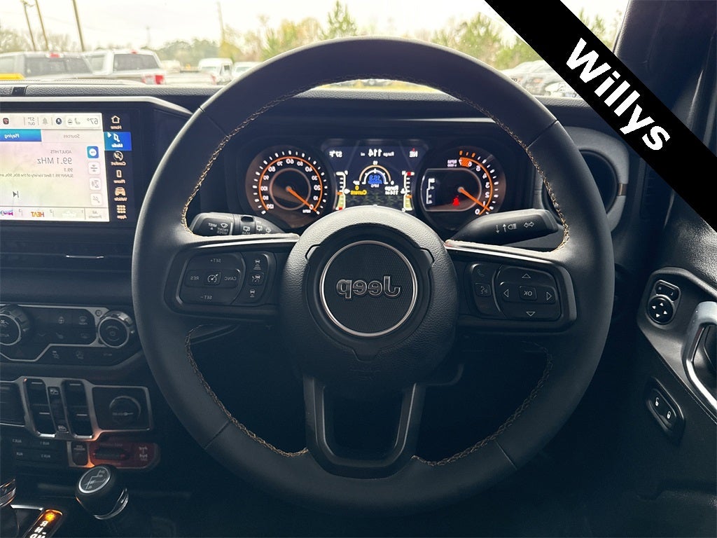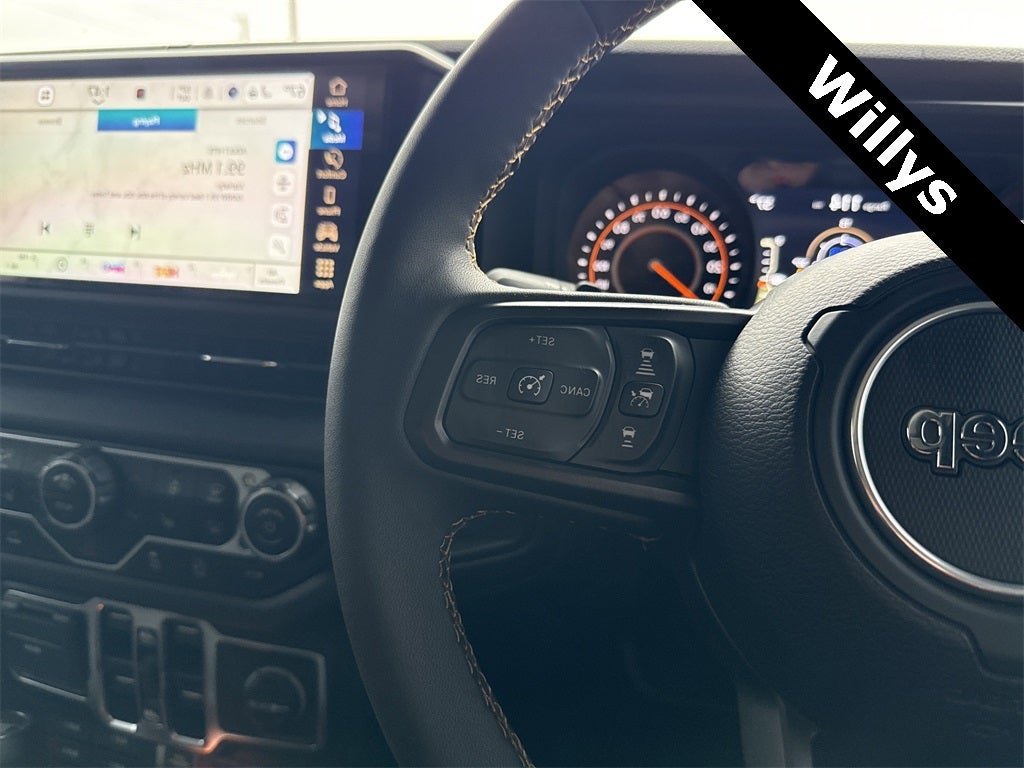 Convenience Group (2-Door Passive Entry, Front Door Locks, Air Conditioning w/Auto Temperature Control, Air Filtering, Cluster 7.0 TFT Color Display, Emergency/Assistance Call, Heated Front Seats, Heated Steering Wheel, Remote Start System, and Universal Garage Door Opener), Quick Order Package 24W Willys (240 Amp Alternator, 4-Wheel Drive Swing Gate Decal, 7 & 4 Pin Wiring Harness, 97 MPH Vehicle Max Speed Calibration, Advanced Brake Assist, Automatic Headlamps, Auxiliary Switches, Black Grille, Class II Receiver Hitch, Conventional Differential Front Axle, Corning Gorilla Glass, Dana M210 Wide HD Tube Front Axle, Dana M220 Wide Rear Axle, Daytime Running Lamps LED Accents, Deep Tint Sunscreen Windows, E-Locker Rear Axle, Enhanced Adaptive Cruise Control, Front 1-Touch Down Power Windows, Front LED Fog Lamps, Full Speed Forward Collision Warning Plus, Injection Molded Black Rear Bumper, LED Premium Reflector Headlamps, Mold In Color Bumper w/Gloss Black, Molded in Color Rubicon Highline Flare, MOPAR All-Weather Floor Mats, Off-Road Plus Mode, Power Heated Mirrors, Premium Wrapped Steering Wheel, Remote Keyless Entry, Security Alarm, Speed Sensitive Power Locks, Sun Visors w/Illuminated Vanity Mirrors, Wheels: 17 x 7.5 Painted Black, Willy's Suspension, Willys, and Willys Hood Decal), Technology Group (Alpine Premium Audio System), 110 MPH Vehicle Max Speed Calibration, 4-Wheel Disc Brakes, 8 Speakers, ABS brakes, Air Conditioning, AM/FM radio, Apple CarPlay/Android Auto, Aux Battery, Black 3-Piece Hard Top, Brake assist, Cloth Low-Back Bucket Seats, Compass, Delay-off headlights, Driver door bin, Driver vanity mirror, Dual front impact airbags, Dual front side impact airbags, Electronic Stability Control, Freedom Panel Storage Bag, Front anti-roll bar, Front Bucket Seats, Front Center Armrest w/Storage, Front fog lights, Front reading lights, Integrated roll-over protection, Jeep Trail Rated Kit, Low tire pressure warning, No Soft Top, Non-Lock Fuel Cap w/o Discriminator, Normal Duty Suspension, Occupant sensing airbag, Outside temperature display, Overhead airbag, ParkView Rear Back-Up Camera, Passenger door bin, Passenger vanity mirror, Power steering, Radio data system, Radio: Uconnect 5 w/12.3 Display, Rear anti-roll bar, Rear reading lights, Rear Window Defroster, Rear Window Wiper/Washer, Speed control, Split folding rear seat, Steering wheel mounted audio controls, Stop-Start Dual Battery System, Tachometer, Telescoping steering wheel, Tilt steering wheel, Traction control, Trip computer, Variably intermittent wipers, and Wheels: 17 x 7.5 Black Steel Styled.