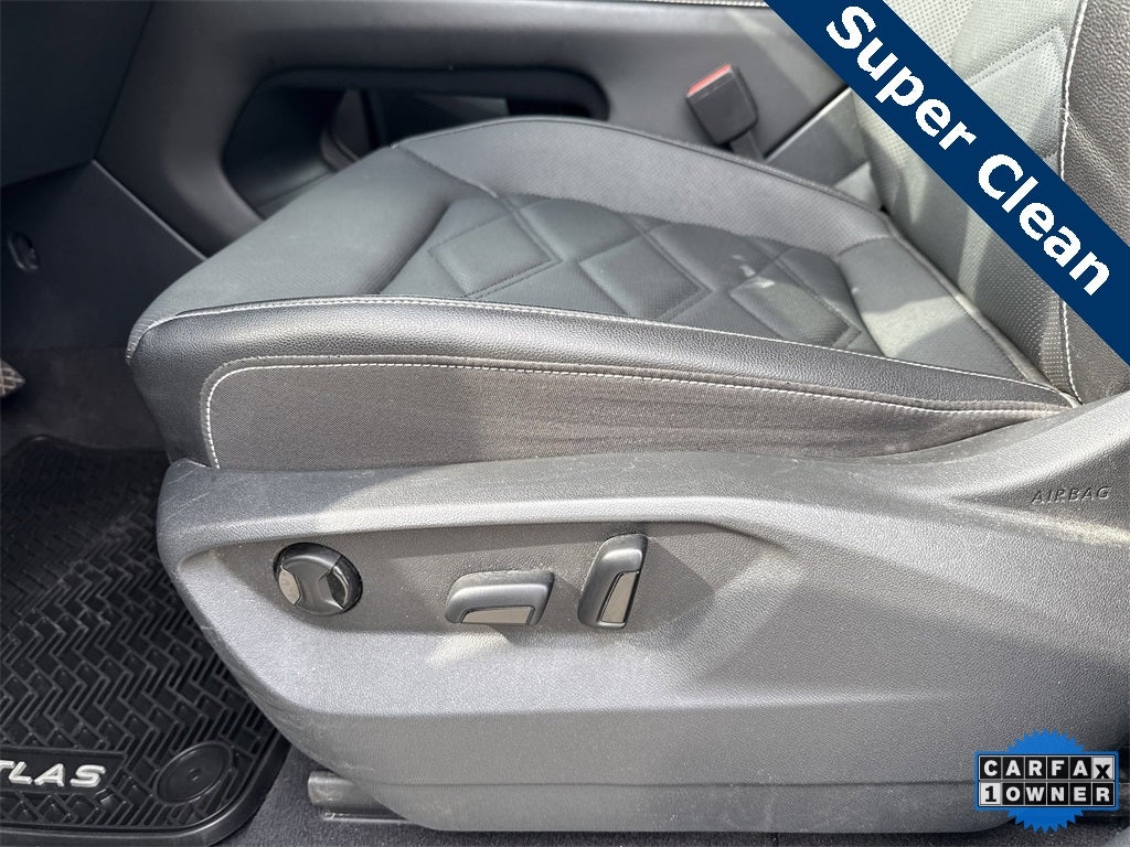 3.60 Axle Ratio, 3rd row seats: split-bench, 4-Wheel Disc Brakes, 6 Speakers, ABS brakes, Air Conditioning, Alloy wheels, AM/FM radio: SiriusXM with 360L, Auto-dimming Rear-View mirror, Automatic temperature control, Brake assist, Bumpers: body-color, Compass, Delay-off headlights, Driver door bin, Driver vanity mirror, Dual front impact airbags, Dual front side impact airbags, Electronic Stability Control, Emergency communication system: VW Car-Net Safe & Secure 5-year, Exterior Parking Camera Rear, Four wheel independent suspension, Front anti-roll bar, Front Bucket Seats, Front Center Armrest, Front dual zone A/C, Front fog lights, Front reading lights, Fully automatic headlights, Heated door mirrors, Heated front seats, Heated steering wheel, Heated/Actively Ventilated Front Bucket Seats, Illuminated entry, Low tire pressure warning, Occupant sensing airbag, Outside temperature display, Overhead airbag, Overhead console, Panic alarm, Passenger door bin, Passenger vanity mirror, Perforated V-Tex Leatherette Seating Surfaces, Power door mirrors, Power driver seat, Power Liftgate, Power steering, Power windows, Radio data system, Radio: MIB3 Composition Media, Rain sensing wipers, Rear air conditioning, Rear anti-roll bar, Rear reading lights, Rear seat center armrest, Rear window defroster, Rear window wiper, Remote keyless entry, Security system, Speed control, Speed-sensing steering, Split folding rear seat, Spoiler, Standard Suspension, Steering wheel mounted audio controls, Tachometer, Telescoping steering wheel, Tilt steering wheel, Traction control, Trip computer, Turn signal indicator mirrors, Variably intermittent wipers, Ventilated front seats, and Wheels: 20 2-Tone Machined Alloy.